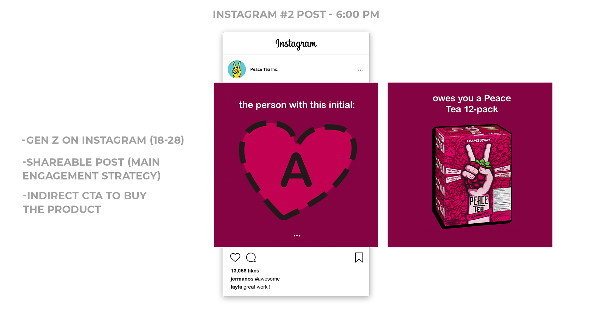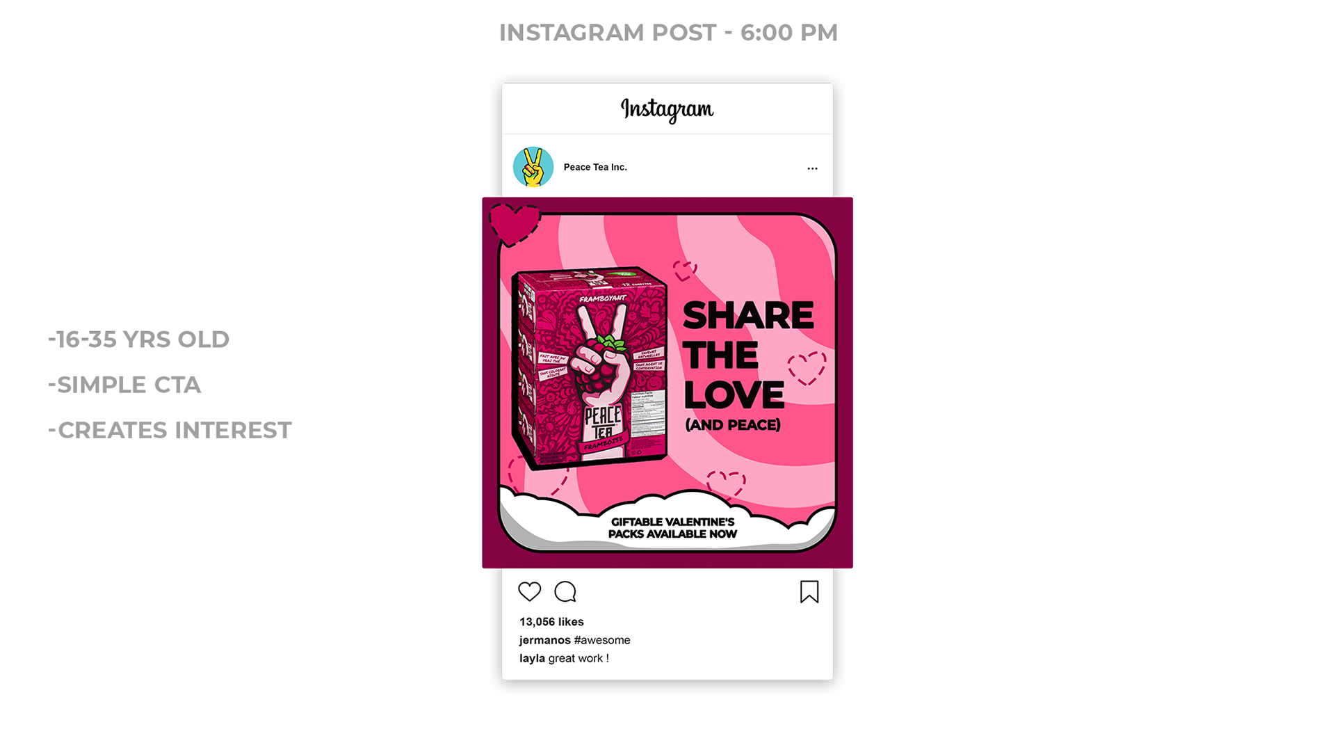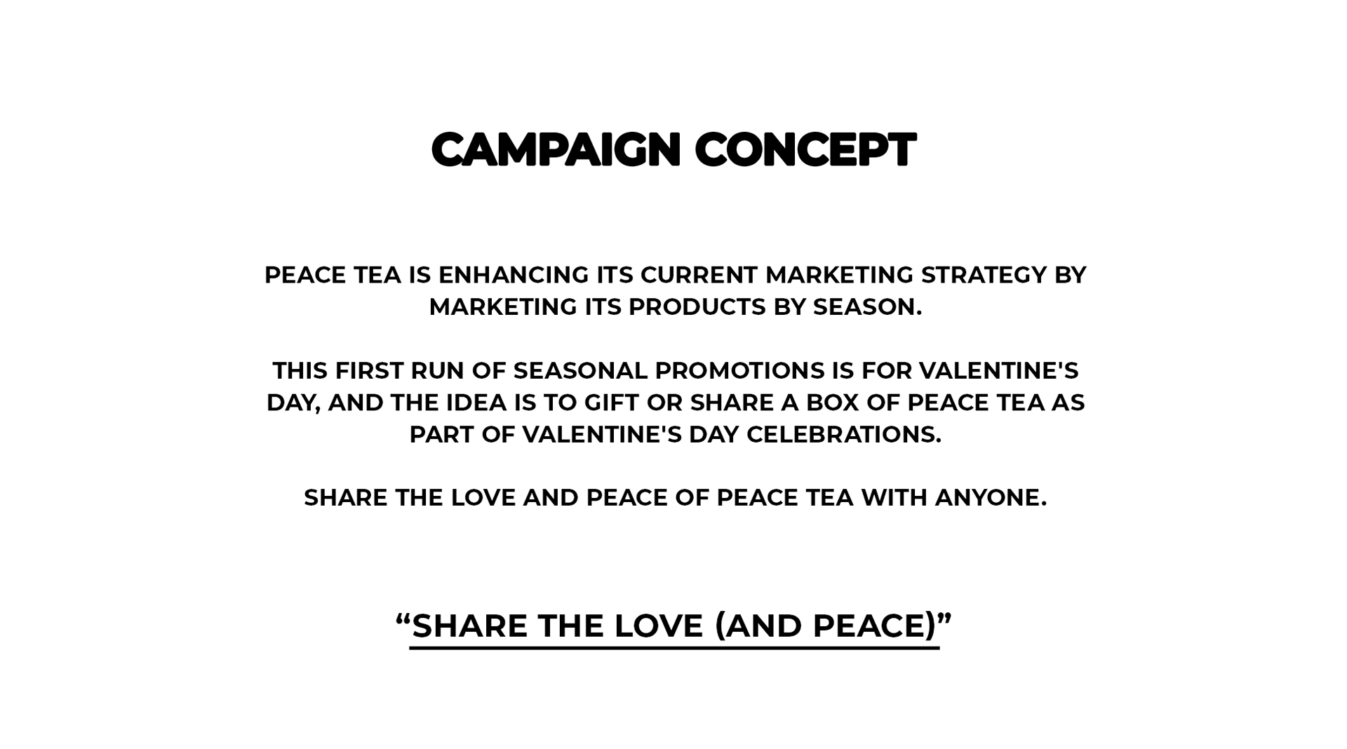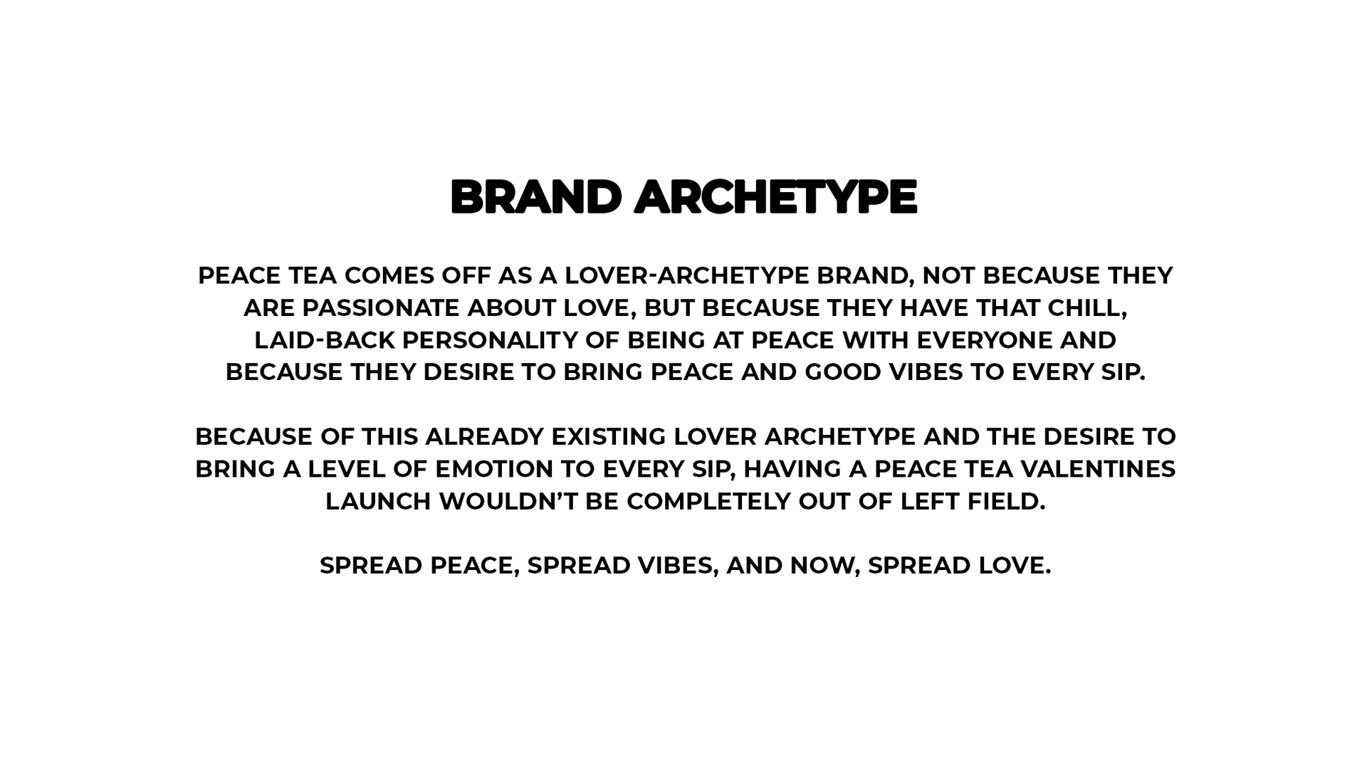 The goal for this assignment was to create a holiday campaign with graphics for an existing brand. The campaign should fit the archetype of the brand. I chose Peace Tea because I enjoy the drink, but also because I could see spreading love as an extension of the brand's current messaging of spreading peace.